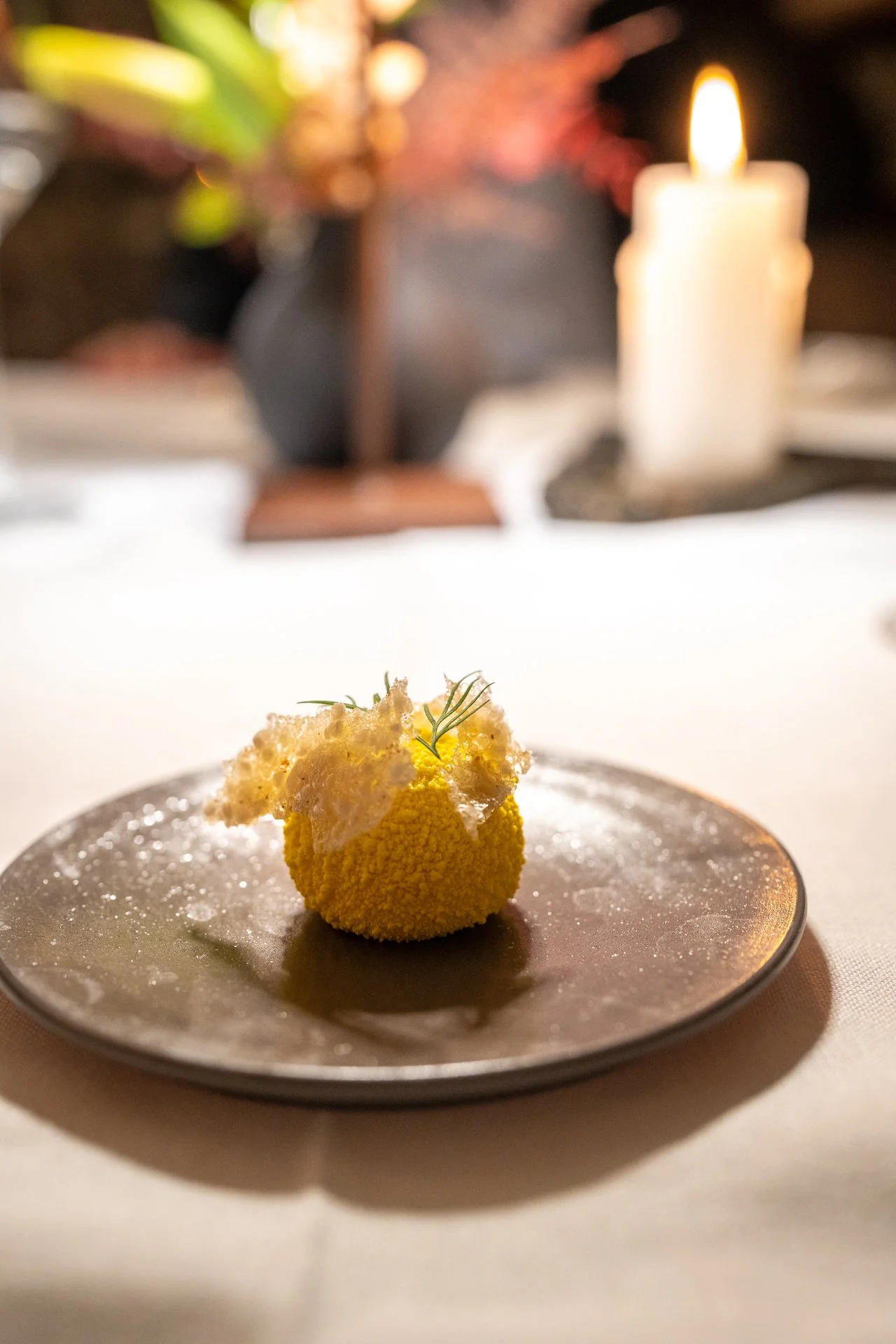 Amuse Bouche: Safran-Praline und eine würzige Panna Cotta – ein perfekter Auftakt, der durch intensive Aromen besticht.