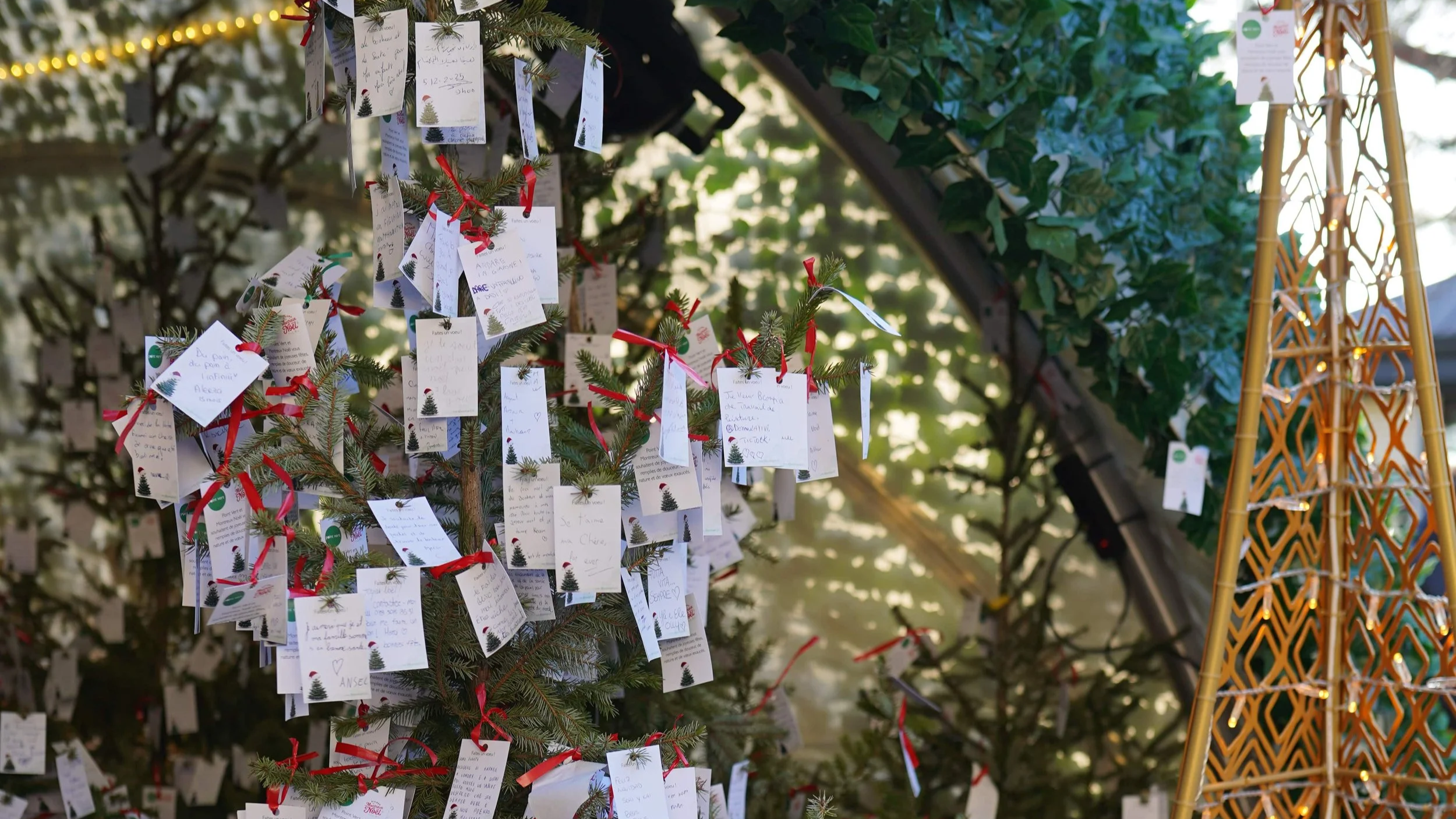 Zwischen beleuchteten Tannen hängen hunderte kleiner Zettel mit handgeschriebenen Wünschen.