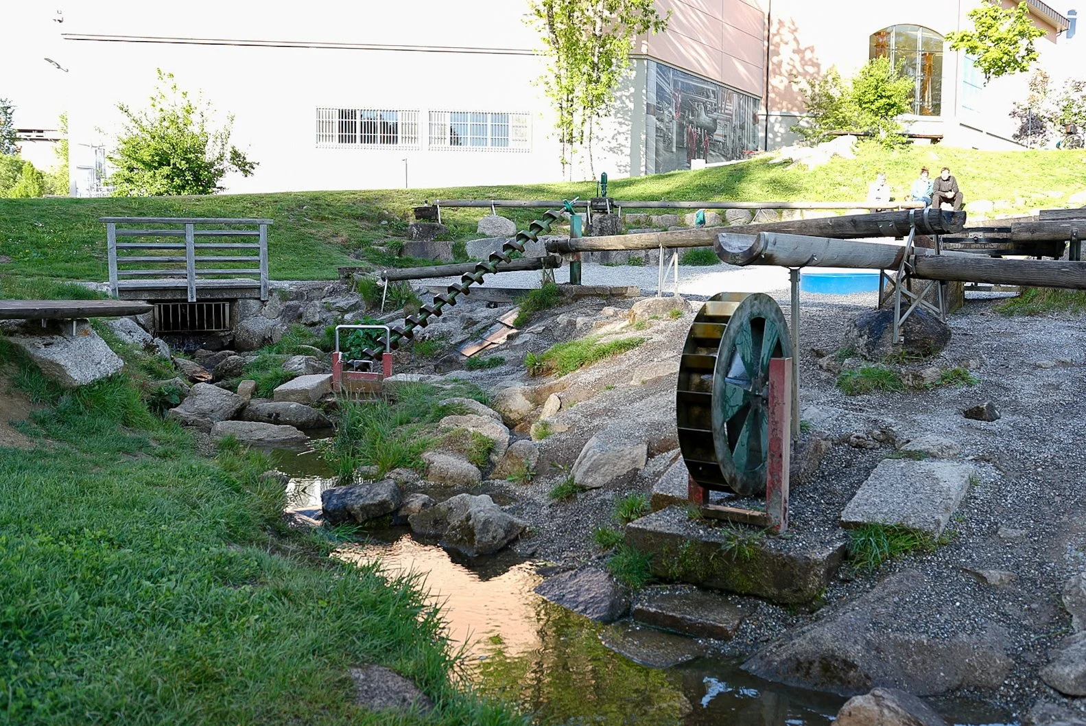 Ein Wasserbereich mit Wasserrad und Pumpe, der sich perfekt zum Matschen und Staumauerbauen eignet
